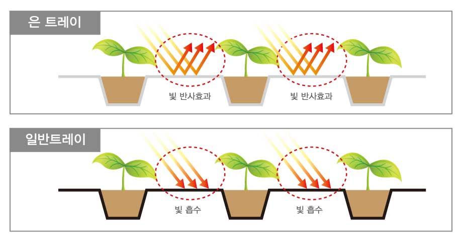 하절기에는 트레이의 표면온도에 있어 일반트레이에 비해 은트레이의 온도가 약 5~7℃ 낮아 근권의 스트레스를 줄일 수 있고, 지상부(대기)의 습도를 낮추어 주어 과습으로 인한 발병율을 감소시킵니다. 동절기 육묘에는 빠른 시간 내 온실의 온도를 상승시켜 온도에 대한 관리가 우수하고, 냉해 및 저온장해로부터 관리가 용이합니다.